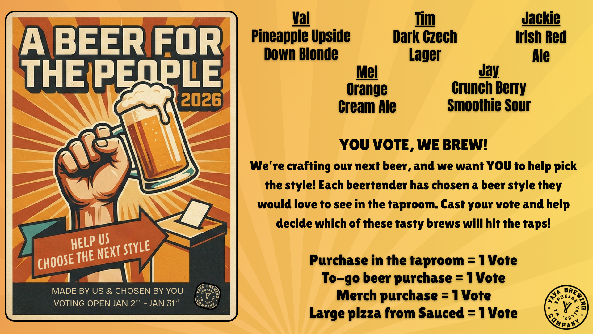 We’re crafting our next beer, and we want YOU to help pick the style! Each beertender has chosen a beer style they would love to see in the taproom. Swing by the taproom Jan. 2nd - 31st to cast your vote and help us decide which beer we'll be making next! This year's